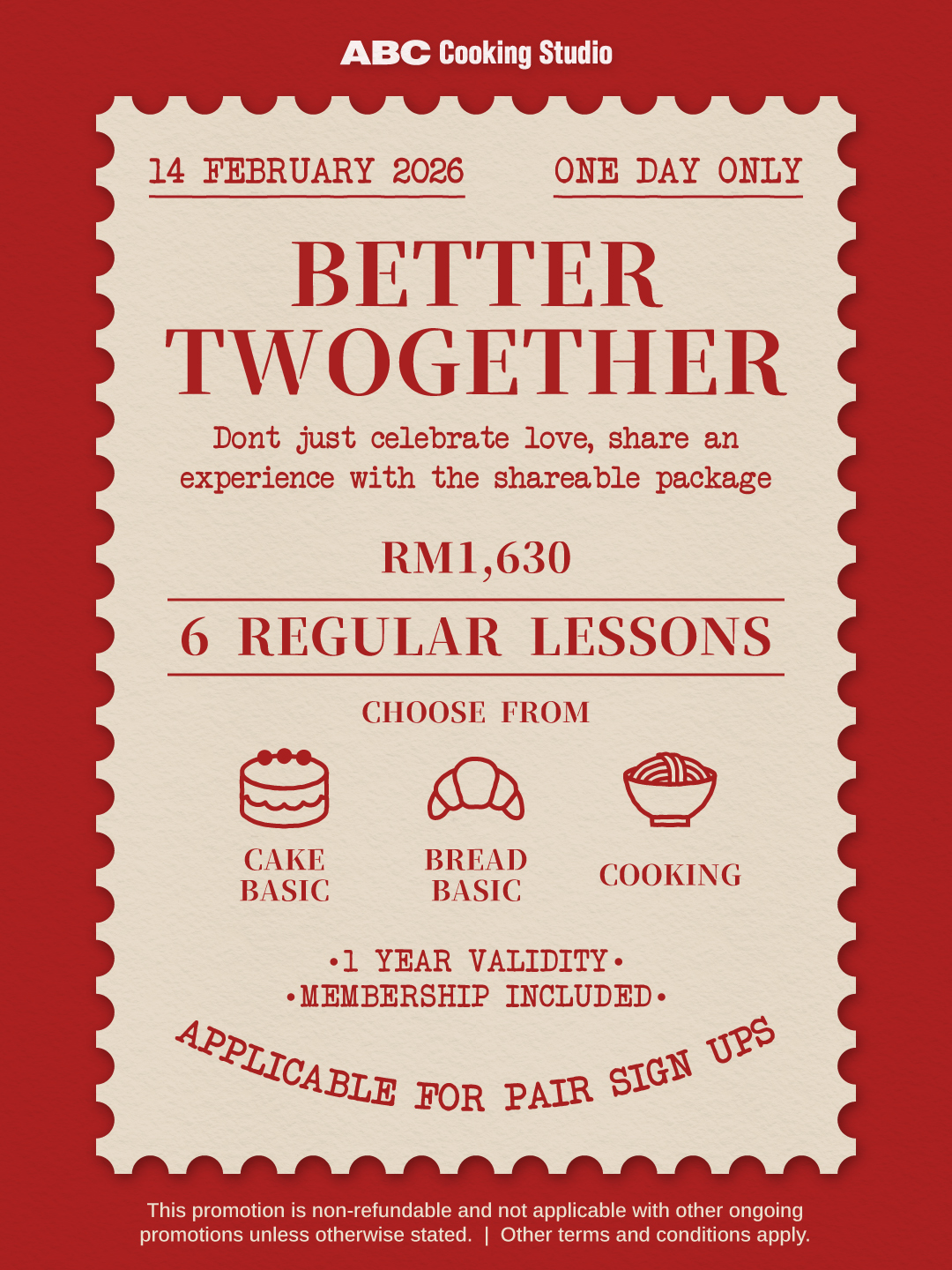 Applicable for pair sign ups, begin a shared learning experience in baking and cooking with 6 Regular Lessons at RM1,630, where you’ll be able to pick from our wide range of Cake Basic, Bread Basic and Cooking Course menus with 3 lessons per person.